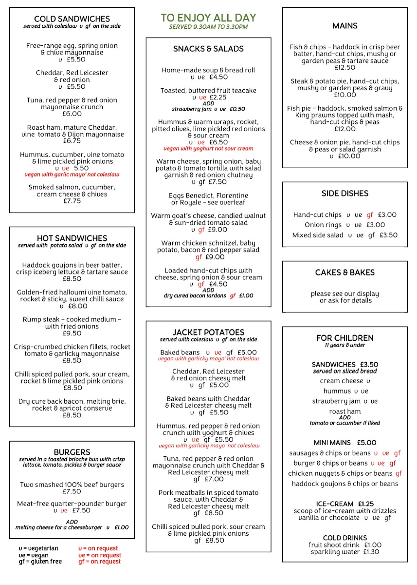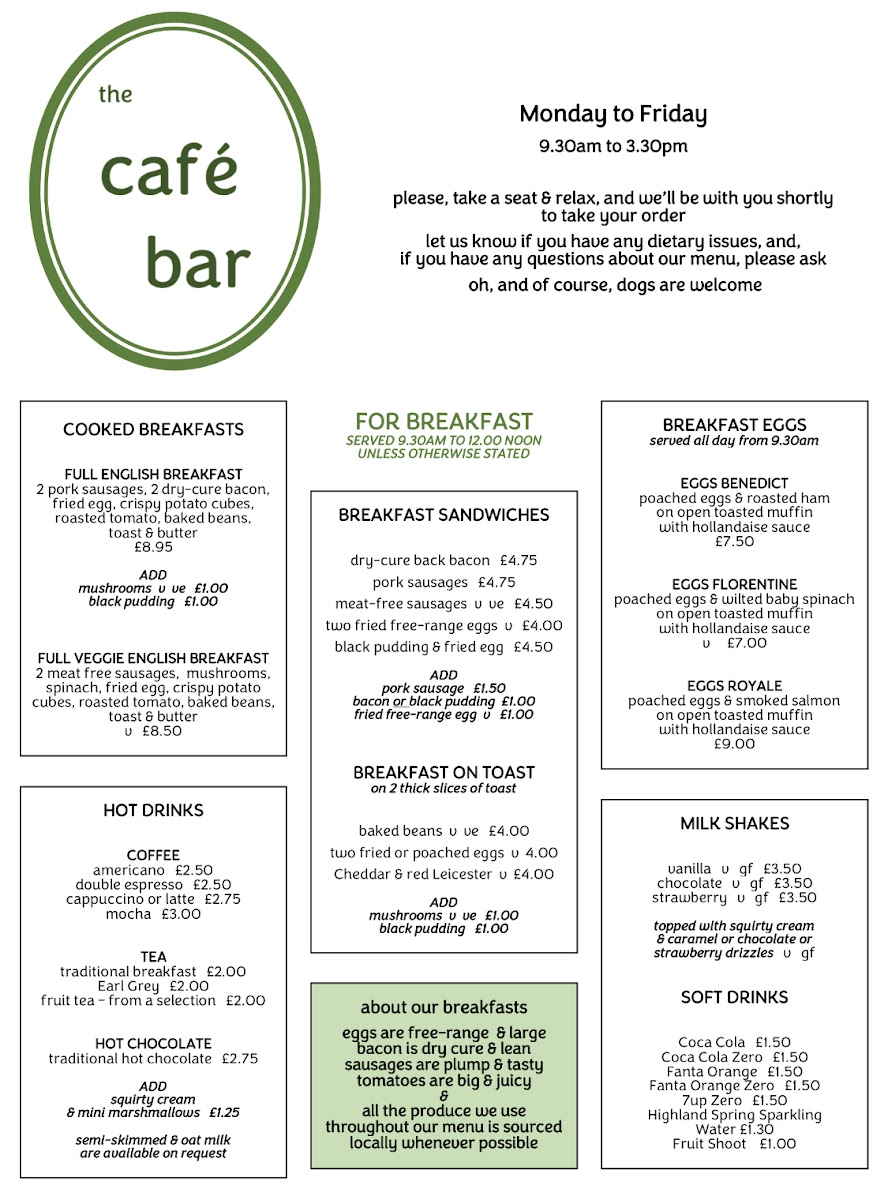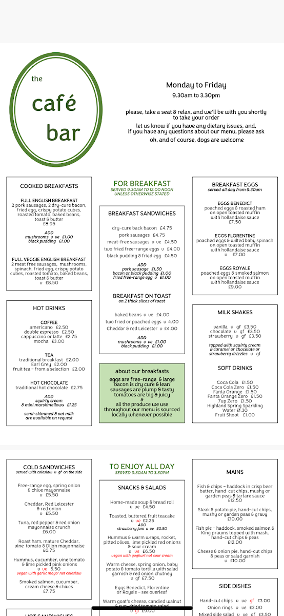 This menu is well-suited to a welcoming café bar where the focus remains on good, straightforward food with an emphasis on seasonal and fresh ingredients. Whether stopping by for breakfast, enjoying a weekend lunch, or settling in for an evening drink, the menu complements the relaxed and friendly vibe that characterizes the space.